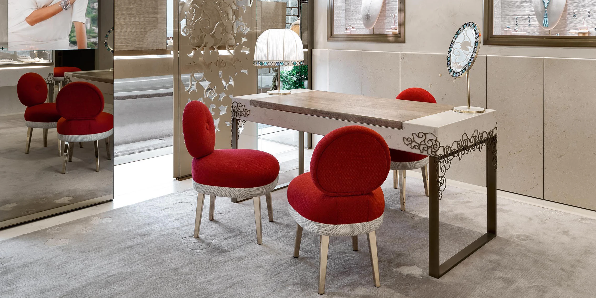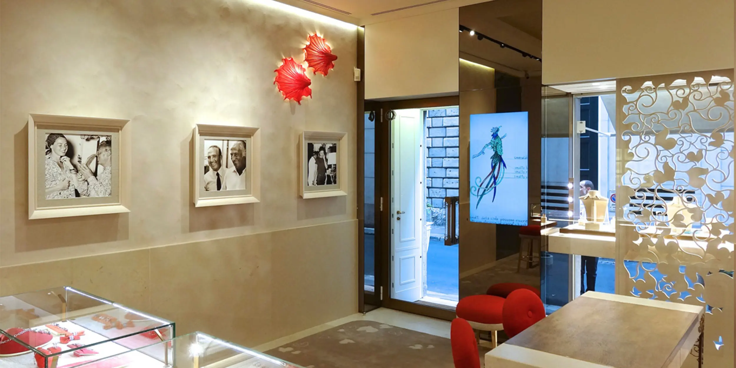 All’interno, un’atmosfera fresca e familiare accoglie il visitatore: pareti in stucco irregolare si alternano a rivestimenti in marmo e teche che espongono i gioielli simbolo della maison come in un museo. L’eleganza nasce dalla combinazione di materiali naturali — vetro, pietra, stucco e fibra di fico d’India — arricchiti da tocchi di corallo nelle sedute e nelle applique in seta.