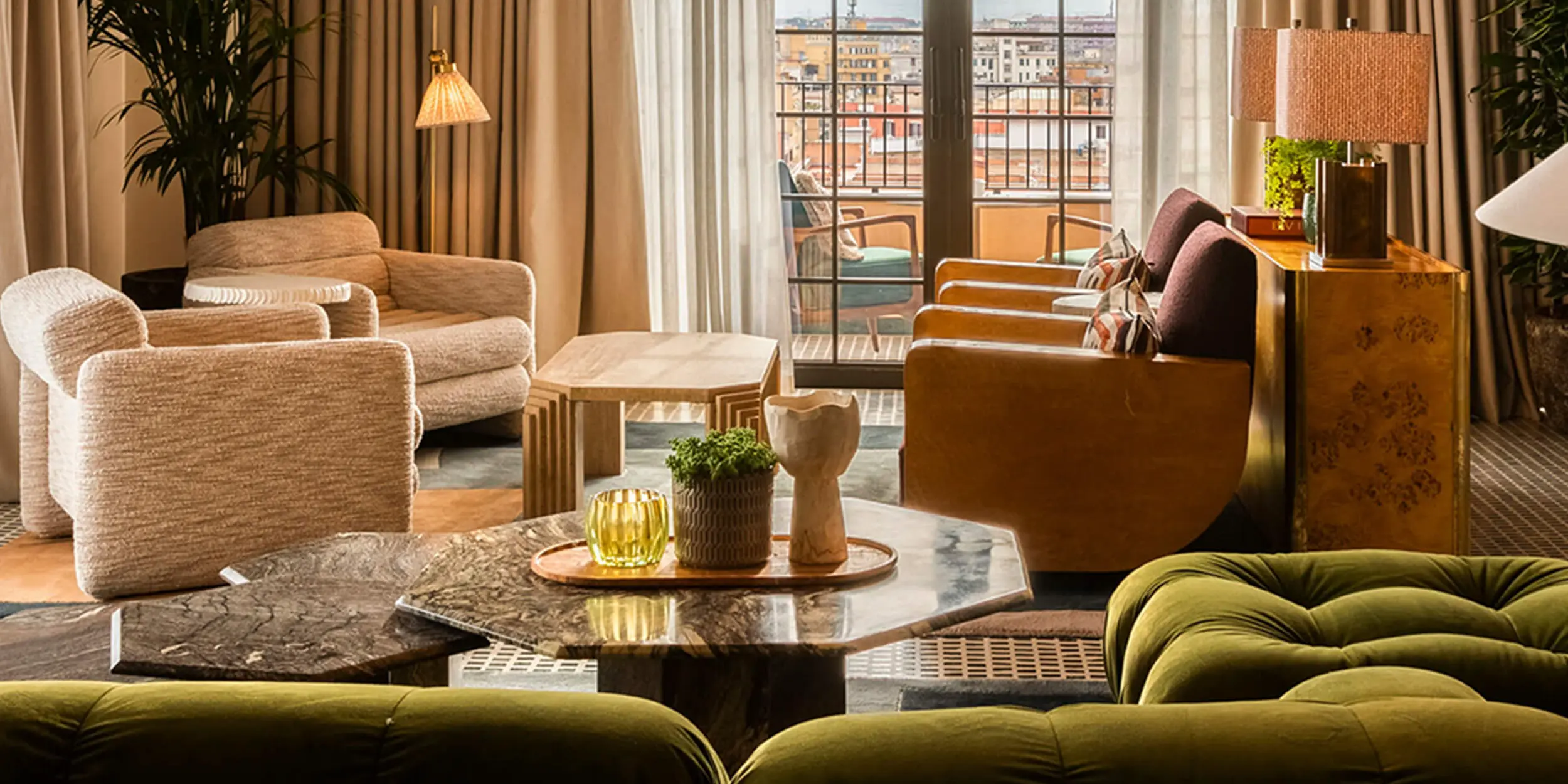 Divani, poltrone e pouf rivestiti in tessuti pregiati, tavolini scolpiti nel marmo e dettagli in legno pregiato dialogano con l’architettura del luogo.